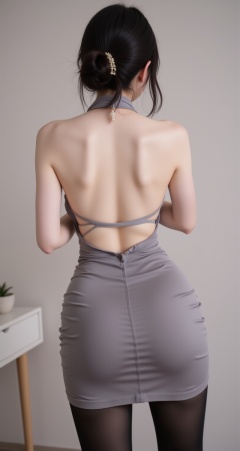 <lora:背影杀4:1>,beiyingsha,1girl,solo,from behind,thighhighs,ass,back,indoors,facing away,black hair,black thighhighs,skirt,bare shoulders,grey dress,dress,single hair bun,hair bun,grey skirt,median furrow,standing,backless outfit,cowboy shot,17,cover,simple background,gradient background,close-up details,outstanding style,adding a touch of dimension to your images without compromising details,close-up,<lora:DJ滤镜_2.5D版:0.3>,lvjing,