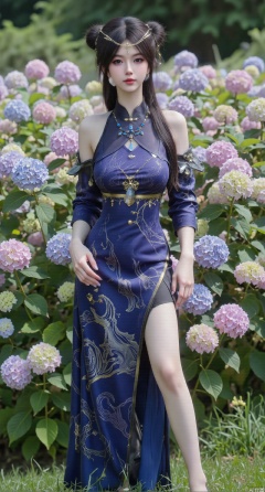 SFW,(masterpiece:1.2),best quality,absurdres,masterpiece,original,extremely detailed wallpaper,perfect lighting,1girl,solo,looking at viewer,(cowboy_shot:1.3),long hair,high heels,blurry background,depth of field,motion blur,(long dress:1.23),china_dress,chinese_style,bare shouders,crystal_earrings,headpiece,hair_tie,chest_jewel,gem,necklace,jewelry,in summer,day,outdoors,nature,garden,,(standing,Hydrangea, Hydrangea Field:1.59),(huge breasts:2.99),(full breasts:2.99),Xzhihua,Xsiyouyou,Xyanruyu,Xmoxiaonan,Xyeqingxian,Xyunwangshu,XlishaoyinY