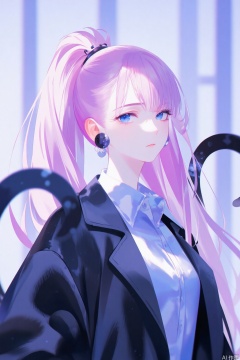 An anime girl with long pink hair and blue eyes. She is wearing a black jacket with a white collar and a white shirt underneath. Her hair is tied up in a ponytail. Her eyes are a piercing blue color. She has a black cat tail on her left side. The cat tail is black and has white spots on it. The background behind her is a light blue and purple color.