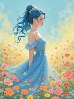 mlzhiyu,A digital painting of a young woman with fair skin and blue hair styled in an elegant updo, standing in a field of colorful flowers. She is wearing a blue, sparkly dress with off-the-shoulder sleeves, and her eyes are closed, giving a serene expression. The background is a soft, gradient of blue and yellow, with a dreamy, ethereal atmosphere. The flowers around her are in various shades of pink, orange, and yellow. The style is semi-realistic with a touch of fantasy. The woman is positioned in the center of the image, facing slightly to the right.<lora:f-治愈系插画v1.3:1>