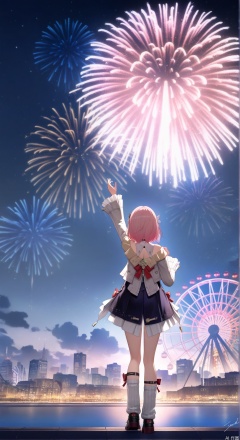 3d,anime,colorful,sky, cloud, signature, from behind, arm up, night, building, star \(sky\), night sky, scenery, starry sky, city, silhouette, cityscape, dark, fireworks,ferris wheel,
