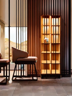 JJCJ, Photograph of a modern, minimalist living room with a focus on sleek, contemporary design. The room features a large, floor-to-ceiling wooden cabinet with vertical slats, illuminated by subtle, warm lighting from within. To the left, a large window with sheer white curtains lets in soft, natural light. In the foreground, a round, upholstered stool with a light brown seat and white, textured fabric sits on a light gray, tiled floor. The background showcases a staircase with light-colored steps and a neutral-toned carpet. The overall aesthetic is clean, elegant, and sophisticated.