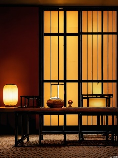 JJCJ, A minimalist Japanese-style room with a warm, serene atmosphere. The image features a wooden sliding door with a black frame on the right, a traditional Japanese paper screen, and a framed calligraphy scroll on the left. The room is dimly lit with a soft, warm glow from a cylindrical, beige lamp on the right. A black, cushioned chair is positioned in the foreground, and a wooden bench is against the wall. The floor is covered with dark, textured tiles, and a soft, woven rug is partially visible in the lower right corner. The overall color palette is neutral and earthy.