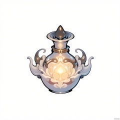 GFTB, A traditional Chinese ink-style game item icon featuring a glowing elixir bottle. The bottle is intricately designed with cloud motifs and has a soft, ethereal glow emanating from it. The background is a simple white, enhancing the mystical aura of the elixir. The overall style is clean yet evocative, focusing on the bottle's ancient charm and magical properties