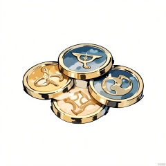 GFTB, An ink wash icon featuring a set of enchanted coins with mysterious symbols on them. The coins are arranged in a circular pattern, hinting at their magical properties and the secrets they hold. Against the plain white background, the coins stand out as currency with hidden powers in the game.