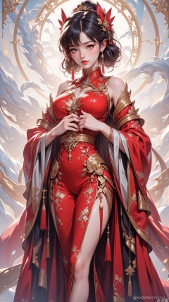 The image depicts a beautifully rendered digital artwork of a woman dressed in traditional East Asian attire. She is adorned in intricate red and gold garments with floral patterns, and her hair is styled elaborately with ornate hairpieces and dangling earrings. Her hands are clasped together in front of her chest, and she has a serene expression. The background is ethereal, with soft, flowing white and light-colored fabric that creates a sense of movement and grace. The overall composition is elegant and artistic, with a focus on the detailed textures and colors of the clothing and accessories.