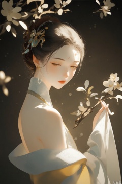 ((ultra realistic photograph)), (highest quality 8K resolution), [intricate details: skin pores, eyelash strands, fabric texture], [lighting: cinematic rim lighting + soft diffused key light], depth of field f/1.4, Hasselblad H6D-400c, [color grading: muted tones with warm/cool contrast], hyperrealistic human anatomy, natural body posture, environment reflection in eyes, [texture contrast: matte skin vs glossy lips], film grain simulation, Academy Color Encoding System, Low-key Rembrandt lighting with chiaroscuro effect, full-body shot from head to toe,full-length portrait,entire figure visible,complete anatomy showing feet to head,(photorealistic:1.3) , 1girl, branch, solo, long hair, jewelry, earrings, hair ornament, forehead mark, dress, flower, facial mark, looking at viewer, from side, upper body, bare shoulders, chinese clothes, black hair, brown hair, white dress, hair bun, off shoulder, moon, closed mouth, expressionless, long sleeves, make-up