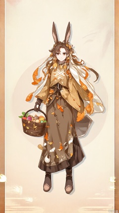 GFLH, a female character with long, curly brown hair, wearing a cozy, knitted sweater and skirt in earthy tones, adorned with autumn leaf patterns. She has squirrel ears and a warm smile, holding a basket of acorns in one hand and looking content. The simple white background accentuates her cozy, autumnal charm.