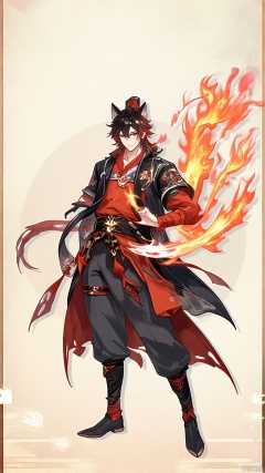 GFLH, a male character with spiky, fiery red hair, dressed in a modernized version of a tangzhuang suit, featuring bold black and red patterns inspired by ancient Chinese dragons. He boasts wolf ears and a sleek, red armband. Wielding a glowing sword with one hand and standing in a defiant stance, he exudes strength and courage. The white background emphasizes his fierce, warrior-like demeanor.