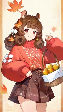 GFLH, a female character with long, curly brown hair, wearing a cozy, knitted sweater and skirt in earthy tones, adorned with autumn leaf patterns. She has squirrel ears and a warm smile, holding a basket of acorns in one hand and looking content. The simple white background accentuates her cozy, autumnal charm.