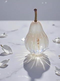 JYTT, A single, whole pear, sliced into thin wedges and arranged in a fan shape, emphasizing its elongated shape and juicy, white interior. The pear wedges are placed on a marble surface, with shadows and highlights accentuating their fresh, crisp texture. The background is a soft, gray gradient, with small, scattered silver leaves around the pear, adding a touch of modern elegance and sophistication to the composition. The lighting is soft and even, casting a cool, refreshing glow and creating a calm, almost minimalist atmosphere. The overall aesthetic is minimalist and contemporary, with a focus on the natural beauty of the fruit and the subtle play of light and shadow.