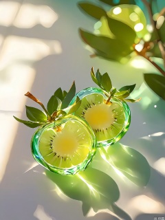 JYTT, A single, whole kiwi, peeled and sliced into rounds, with the rounds arranged in a spiral pattern, resembling a tropical flower. The kiwi slices are placed on a glass surface, with shadows and highlights accentuating their bright green color and juicy texture. The background is a soft, teal gradient, with small, scattered fern leaves around the kiwi, adding a touch of botanical freshness and elegance to the composition. The lighting is soft and filtered, casting a cool, refreshing glow and creating a calm, almost ethereal atmosphere. The overall aesthetic is minimalist and modern, with a focus on the natural vibrancy of the fruit and the play of light and shadow.