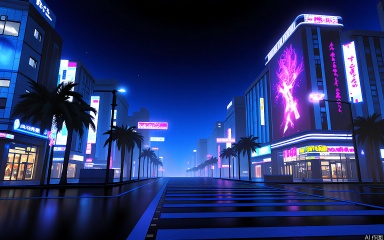 YXCJ A vibrant, neon-lit cityscape at night, featuring towering skyscrapers with various advertisements and billboards. The scene is bustling with activity, with a prominent billboard on the right displaying a dancing figure in pink and purple hues. The colors are predominantly blue, purple, and pink, with a futuristic, cyberpunk aesthetic. The street below is empty, with a few scattered cars. The sky is dark, with a few stars visible. The overall atmosphere is dynamic and energetic, with a sense of movement and excitement. The image is a digital artwork, possibly inspired by anime or video game art styles.