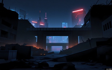 YXCJ A dark, atmospheric digital painting of a dystopian cityscape at night, with a large bridge in the foreground. The background features tall, illuminated skyscrapers with a dark, smoky sky. The city is in disrepair, with broken buildings and debris scattered throughout. The lighting is moody, with red and blue neon lights creating a stark contrast. The scene is tense and desolate, with a sense of abandonment. The style is reminiscent of cyberpunk and dystopian art.