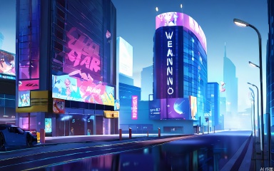YXCJ A vibrant, neon-lit cityscape at night, featuring towering skyscrapers with various advertisements and billboards. The scene is bustling with activity, with a prominent billboard on the right displaying a dancing figure in pink and purple hues. The colors are predominantly blue, purple, and pink, with a futuristic, cyberpunk aesthetic. The street below is empty, with a few scattered cars. The sky is dark, with a few stars visible. The overall atmosphere is dynamic and energetic, with a sense of movement and excitement. The image is a digital artwork, possibly inspired by anime or video game art styles.