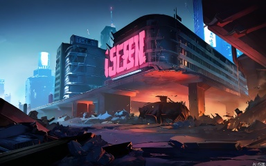 YXCJ A dark, atmospheric digital painting of a dystopian cityscape at night, with a large bridge in the foreground. The background features tall, illuminated skyscrapers with a dark, smoky sky. The city is in disrepair, with broken buildings and debris scattered throughout. The lighting is moody, with red and blue neon lights creating a stark contrast. The scene is tense and desolate, with a sense of abandonment. The style is reminiscent of cyberpunk and dystopian art