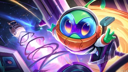 YXLM, A vibrant digital illustration of a futuristic space scene. A person wearing a sleek, silver spacesuit with a visor and a breathing apparatus sits in the cockpit of a high-tech spaceship. The ship is sleek and metallic, with a large, glowing blue engine at the front. A small, green alien with large eyes and antennae perches on the cockpit's edge. The background features a starry space with a large, purple, ghostly figure and smaller, floating, purple creatures. The style is reminiscent of a sci-fi video game, with dynamic lighting and a sense of action.