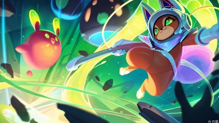 YXLM, Digital art, fantasy, sci-fi, dynamic composition, vibrant colors, glowing elements, high contrast, neon green and purple, futuristic setting, robot-like character with cat ears and a helmet, pointing with one hand, holding a glowing staff in the other, intricate armor with glowing green accents, intricate details, floating platforms, floating creatures, dynamic lighting, energy beams, floating debris, energetic atmosphere, otherworldly landscape, sci-fi architecture, neon lights, high-tech environment, sense of motion, glowing green eyes, floating structures, intricate design, sci-fi aesthetic, neon glow, glowing elements, high-tech, glowing green staff, glowing green accents, glowing green eyes, glowing green background, glowing green energy beams