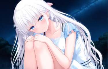 <lora:Naruse_Shiroha_-_Summer_pockets_IL:1>,<lora:StS-Illustrious-Detail-Slider-v1.0:4>,masterpiece, best quality, highres, newest, scenery, 1girl, solo, official style,Shiroha,very long hair,white hair,hair ribbon,pink ribbon,blue eyes,bangs,hair between eyes,Casual Shiroha,dress,white dress,collarbone,short sleeves,blush, looking at viewer,affectionate,detailed eyes,dark background,night, star (sky),starry sky,sad smile, half-closed eyes,knees up,hands on own knees,head tilt,knees to chest,four fingers,