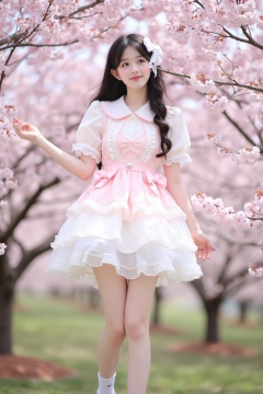 Lolita,This is a high-resolution photo of an Asian woman posing in front of a background of blooming cherry blossoms, creating a soft pink and white color scheme. She is wearing an imaginative flounced white and pale pink short-sleeved dress with a wide flounced skirt. The outfit is adorned with delicate lace and pink bows, adding a touch of sweetness to her attire. She is wearing black Mary Jane shoes and white socks, with a white bow on the left side. Her long dark hair hangs down her back, decorated with a larger white bow on the right, creating a playful contrast with her clothing.She stands straight with a calm expression, a slight smile at the corners of her mouth, and her eyes looking upward. The background features cherry blossoms, lush branches, creating a serene and ethereal atmosphere. The entire scene is vibrant and dreamlike, evoking the essence of spring and exquisite beauty.