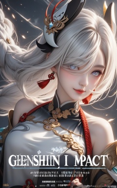 masterpiece,Realism,best quality, 1girl, solo, upper body, very long white braided hair with a braided ponytail, hair over one eye, bangs, blue eyes, looking at viewer, blush, smile, parted lips, hair ornament, tassel earrings, tassel, bodysuit with gold trim, clothing cutout, flower, Shenhe (Genshin Impact) style, movie poster, three-dimensional text AGlong in the middle below, cinematic lighting, dynamic composition, detailed background with poster theme, high contrast, sharp focus, dramatic atmosphere.