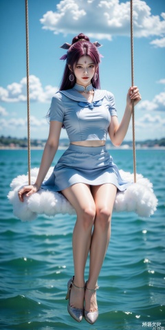 真人肌肤纹理, 4K画质,完美身材,long legs,Film texture, film and television, surrealism, a girl with a delicate face is sitting on a cloud swing. The girl is wearing a jk sailor uniform, a white short-sleeved shirt, light blue stripes trimming, a light blue tie, white blue pleated skirt, exquisite diamond-encrusted high heels, swing rope The sub is connected to a cloud in the sky, the background is a vast ocean, the water shows a consistent blue-green tone, the sky is also blue-green, blending with the ocean, perfect light and shadow, hyper-realistic photography, sharpening, artistic conception, Consciousness, large areas of blank space, sense of space, haziness, dreams, fog,siyouyou, purple hair, hair ornament,forehead mark
