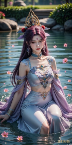 The image depicts a serene and ethereal scene with a female character sitting in a body of water. She has long, flowing hair adorned with delicate flowers and golden ornaments, including a prominent headpiece resembling a crown. Her attire is a white, flowing gown embellished with intricate gold patterns and blue gemstones. The water around her is clear, with small bubbles and floating petals, creating a magical atmosphere. The background features a blurred natural setting with trees and rocks, enhancing the mystical and tranquil ambiance. The overall composition is highly detailed and visually captivating, with a focus on the character's peaceful expression and the enchanting surroundings.,siyouyou, purple hair, hair ornament,forehead mark