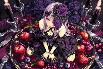 best, 1girl, candle, fruit, solo, dress, flower, fork, knife, purple flower, purple rose, black dress, grapes, rose, food, blueberry, long hair, hair ornament, tongue, tongue out, candlestand, apple, looking at viewer, raspberry, purple eyes, bare shoulders, hair flower, frilled dress, one eye covered, breasts, nail polish, purple nails, wariza, sitting, lace-trimmed dress, lolita fashion, frills, purple hair, gothic lolita, black bow, bracelet, hair bow, lace, lace trim, jewelry, strawberry, detached sleeves, bow, cleavage, hand between legs, berry, plate, from above, goth fashion <lora:lp27New.up1-000038:1>