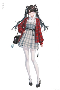 8k,best quality,masterpiece,(ultra-detailed),(high detailed skin),((artist:reoen),(artist:fuzichoco),(artist:atdan),(artist:torino_aqua),year 2024:0.8)1girl,[artist:wlop],[artist:ningen_mame],artist:ciloranko,[[artist:rhasta]],artist:tidsean,colorful,full body,full shot,standing,(solo:1.2),simple background,(white background:1.2),hand on own hip,(white background:1.1),alternate costume,solo,1bag,looking at viewer,plaid,charm (object),bag charm,bangs,contemporary,sidelocks,jewelry,character name,<lora:zhezhi-ill-Tanger:0.8>,zhezhi,default clothes,white pantyhose,1girl,long hair,black hair,glasses,twintails,dress,black footwear,