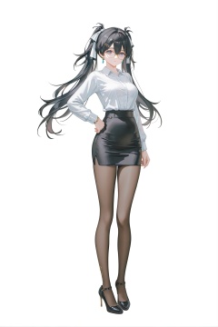 8k,best quality,masterpiece,(ultra-detailed),(high detailed skin),((artist:reoen), (artist:torino_aqua),year 2024:0.8)1girl,[artist:wlop],[artist:ningen_mame],artist:ciloranko,[[artist:rhasta]],artist:tidsean,artist:iumu,full body,full shot,standing,(solo:1.2),simple background,(white background:1.2),hand on own hip,(white background:1.1),<lora:zhezhi-ill-Tanger:0.8>,zhezhi,default clothes,white pantyhose,1girl,long hair,black hair,glasses,twintails,dress,black footwear,1girl,long hair,hair between eyes,jewelry,hair ornament,skirt,office lady,shirt,pencil skirt,pantyhose,white shirt,high heels,black skirt,breasts,black footwear,long sleeves,alternate costume,high-waist skirt,brown pantyhose,contemporary,shirt tucked in,thighs,black pantyhose,miniskirt,medium breasts,collared shirt,