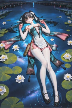 8k,best quality,masterpiece,(ultra-detailed),(high detailed skin),((artist:reoen), (artist:torino_aqua),year 2024:0.8)1girl,[artist:wlop],[artist:ningen_mame],artist:ciloranko,[[artist:rhasta]],artist:tidsean,artist:iumu,artist:nyarko,flowersky,night sky,full body,star \(sky\),night,flower field,starry sky,field,outdoors,white flower,lie on water,float on water,Lake lotus pond,Soaked,lying,<lora:zhezhi-ill-Tanger:0.8>,zhezhi,default clothes,white pantyhose,1girl,long hair,black hair,glasses,twintails,dress,black footwear,