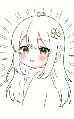 Hand-drawn comics,Hand-drawn comics,black and white line-patterned ( sfw, hair ornament, hair flower, brown eyes, looking at viewer, 1girl, solo, original, flower, eyebrows visible through hair, long hair, bangs, hair between eyes, ahoge, upper body, blush, from side, light rays, light, hair over one eye, closed mouth, white hair, upper teeth, teeth, smile, looking to the side, profile ),
