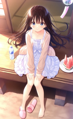 masterpiece,very aware,highres,absurdres,newest,best quality,high quality,loli,petite,chromatic_aberration,//,1girl,wind_chime,long_hair,dress,blue_eyes,solo,sitting,white_dress,barefoot,from_above,smile,collarbone,bottle,brown_hair,watermelon,food,looking_at_viewer,veranda,water_bottle,closed_mouth,looking_up,hands_on_own_knees,fruit,cardigan,sundress,plate,long_sleeves,slippers,wooden_floor,blurry,pink_footwear,very_long_hair,open_clothes,frilled_dress,frills,tatami,outdoors,blush,sandals,floating_hair,hands_on_lap,hair_between_eyes,day,sleeveless_dress,porch,open_cardigan,unworn_sandals,sliding_doors,depth_of_field,No shoes on,//,<lora:kz——【noob】hans-000002:0.8>,
