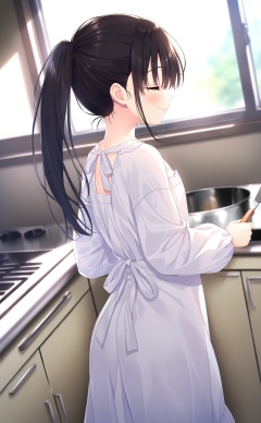 masterpiece,very aware,highres,absurdres,newest,best quality,high quality,loli,petite,chromatic_aberration,//,1girl,indoors,solo,dutch_angle,long_hair,closed_eyes,kitchen,black_hair,ponytail,closed_mouth,long_sleeves,smile,white_dress,dress,blush,blurry_background,day,kappougi,blurry,profile,apron,window,from_side,standing,cooking,nape,straight_hair,puffy_long_sleeves,//,<lora:kz——【noob】hans-000002:0.8>,