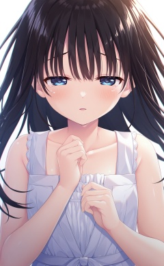 masterpiece,very aware,highres,absurdres,newest,best quality,high quality,loli,petite,chromatic_aberration,//,1girl,solo,long_hair,blue_eyes,black_hair,collarbone,looking_at_viewer,blush,white_dress,dress,sleeveless_dress,sleeveless,parted_lips,hands_up,half-closed_eyes,upper_body,straight-on,bare_shoulders,sundress,tears,white_background,straight_hair,floating_hair,simple_background,own_hands_together,hair_between_eyes,crying,crying_with_eyes_open,//,<lora:kz——【noob】hans-000002:0.8>,
