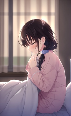 masterpiece,very aware,highres,absurdres,newest,best quality,high quality,loli,petite,chromatic_aberration,//,1girl,solo,black_hair,pajamas,sitting,long_hair,blanket,from_side,hospital_bed,profile,bed,looking_down,blurry_background,blush,scrunchie,indoors,blurry,hair_scrunchie,curtains,hair_over_shoulder,window,hair_ornament,long_sleeves,//,<lora:kz——【noob】hans-000002:0.8>,