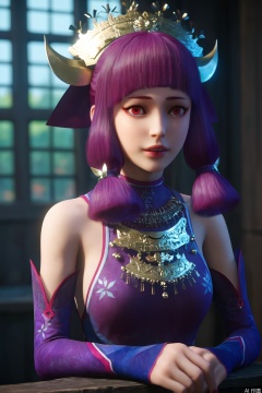 1girl, solo, breasts, looking at viewer, bangs, red eyes, dress, bare shoulders, upper body, purple hair, parted lips, detached sleeves, blunt bangs, nail polish, purple dress