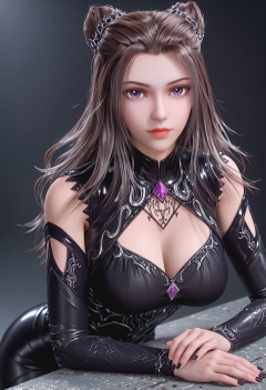 perfect_anatomy,(score_9:1.1),(upper_body:1.2),looking_at_viewer,<lora:YQ_pony_zhuzhuqing_V6:0.8>,1girl,solo,long_hair,hair_bun,black_hair,detached_sleeves,clothing_cutout,cleavage_cutout,purple_eyes,brown_hair,elbow_gloves,jewelry,bodysuit,(black leather pants:1.1),hair_ornament,high_heels,black_footwear,black_dress,perfect_anatomy BREAK (perfect_anatomy:1.1),mature female,(shiny_skin),(Ivory_skin:1.1),(cinematic lighting),(mutated_hands:-0.9),