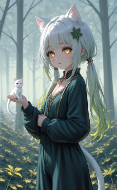 masterpiece, very aware, highres,newest,best quality, loli,petite,chromatic aberration,artist:wlop:0.2,1girl, solo, cat girl, cat eyes, cat ears, cat tail,white tail,white cat ears,flat chest, yellow eyes, goden eyes, Vertical pupils, white hair, green hair, half close eyes,leaf ornament, hair ornament, gradient hair, low twintails, long sleeves,long pants,forest background, (nahida \(genshin impact\):0.5) ,qshy,cxqbwh,