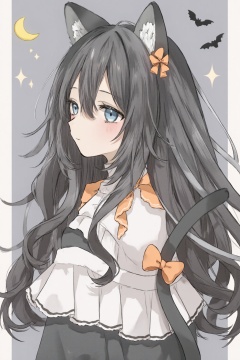 yuni,anime-style character, long wavy hair, blue eyes, cat ears, white top, orange accents, bow, crescent moon, stars, bats, night-time feel