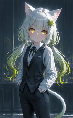 masterpiece, very aware, highres,newest,best quality, loli,petite,chromatic aberration,artist:wlop:0.2,1girl, solo, cat girl, cat eyes, cat ears, cat tail,white tail,white cat ears,flat chest, yellow eyes, goden eyes, Vertical pupils, white hair, green hair, half close eyes,leaf ornament, hair ornament, gradient hair, low twintails,suit, long sleeves,long pants,office room background,sideview, (nahida \(genshin impact\):0.5) ,qshy,cxqbwh,cxbackground