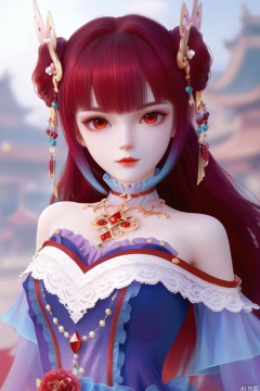 score_9,score_8_up,score_7_up,1girl,solo,long hair,looking at viewer,bangs,brown hair,red hair,hair bun,hair ornament,red eyes,dress,bare shoulders,jewelry,purple hair,choker,gloves,blurry background,simple background,white skin,