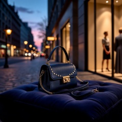 Product Shots,The twilight cityscape sparkles with elegance, streetlights cast a soft glow on cobblestone paths, the faint hum of nightlife fills the air, and a sleek boutique window reflects the allure of urban sophistication. At the center of the scene, a "Midnight Luxe Handbag" rests gracefully on a velvet cushion. Its design gleams in deep navy and silver tones, adorned with subtle star-**** studs and smooth leather accents, embodying the mystery and poise of the night. The meticulous craftsmanship of the workshop weaves the essence of this chic skyline into every stitch, offering a touch of timeless style and the bold spirit of the city with every carry.