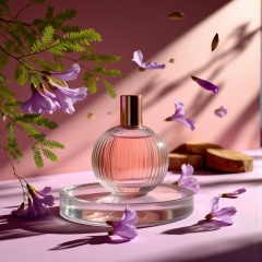 Product Shots,Minimalist luxury packshot background for a women's perfume. Soft,elegant composition in the same color palette : shades of translucent rose pink,delicate mauve and soft gold lighting. Centered on a round,ribbed glass perfume bottle with a metallic rose cap. Set on a clear acrylic pedestal. Surrounding the bottle,branches of jacarandá with feathery green fern-**** leaves and clusters of trumpet-shaped lilac-purple flowers,**** in the Brazilian jacarandá tree. A few flowers are delicately falling mid-air and some are scattered softly on the floor. In the background,subtle pieces of natural wood create warm,earthy contrast. Dreamy golden-hour sunlight streams in from the side,casting soft shadows of flowers and leaves on a matte pink wall. Shot with a Canon EOS R5 + RF 85mm f/1.2L lens,high-resolution,cinematic lighting,extremely realistic and elegant,shallow depth of field,soft bokeh,ultra-detailed. ars 9.16 s 1000,