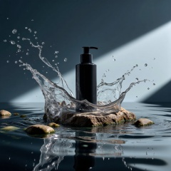 Product Shots,Product photography scene,a black skincare bottle placed on a rock in water,surrounded by transparent splashes,waves,reflections,water droplets,splashes,water ripples,water surface,splashing water,rocks,reflections,transparency,simple background,gradient background,Fujicolor,85mm,Fujifilm,Sony FE GM,UHD,best quality,high quality,HD,8k
