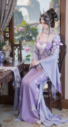 SFW,(masterpiece, best quality:1.2),1girl, solo, long dress,Ancient princess's boudoir with bright color palette,,(huge breasts:2.39),(full breasts:2.39), Hanfu-clad maiden sitting by latticed window desk in romantic daydreaming posture, classical Chinese garden through window showcasing lotus pond filled with blooming pink and white lotuses, delicate ink-wash painting style, interior featuring rosewood furniture with mother-of-pearl inlay, silk curtains fluttering in breeze, porcelain stationery set on desk, distant view of curved bridges and pavilions in garden, ultra HD rendering with crisp details on embroidered garments and translucent lotus petals,,(huge breasts:2.99),(full breasts:2.99),XyueliuY,XanmiaoyiY,Xxiaowu,Xbaixue
