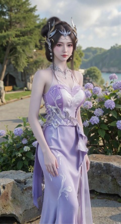SFW,(masterpiece:1.2),best quality,absurdres,masterpiece,original,extremely detailed wallpaper,perfect lighting,1girl,solo,looking at viewer,(cowboy_shot:1.3),long hair,high heels,blurry background,depth of field,motion blur,(long dress:1.23),china_dress,chinese_style,bare shouders,crystal_earrings,headpiece,hair_tie,chest_jewel,gem,necklace,jewelry,in summer,day,outdoors,nature,garden,,(standing,Hydrangea, Hydrangea Field:1.59),(huge breasts:2.99),(full breasts:2.99),,Xzhihua,Xsiyouyou,Xyanruyu,Xmoxiaonan,Xyeqingxian,large natural breast,soft breasts,Xanmiaoyi,Xyunwangshu,XlishaoyinY,Xbaixue,XanmiaoyiY,Xxiuqiuhua