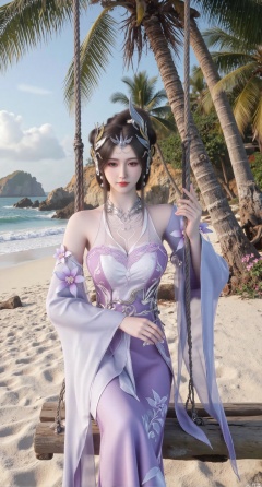 SSFW,(masterpiece:1.2),best quality,absurdres,masterpiece,original,extremely detailed wallpaper,perfect lighting,Golden sandy beach covered with vibrant flowers, turquoise waves gently lapping the shore, elegant woman in embroidered qipao swinging on a wooden swing under coconut trees, bright flower clusters spreading from sand to palm tree roots, soft natural light filtering through coconut leaves, ocean breeze lifting hair and qipao hem, high-resolution details showcasing petal textures and silk fabric sheen, ultra-wide angle lens capturing coastline panorama, cinematic color grading with soft focus on the central figure,(huge breasts:2.99),(full breasts:2.99),Xanmiaoyi,Xyunwangshu,XlishaoyinY,Xbaixue,XanmiaoyiY,Xxiuqiuhua,XbaiyuerongY