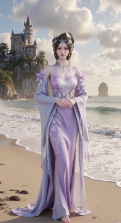 SFW,(masterpiece:1.2),best quality,3d anime style, cg,absurdres,masterpiece,original,extremely detailed wallpaper,perfect lighting,official art, A young woman in embroidered qipao standing barefoot on golden sandy beach, colorful flowers around feet, ocean waves washing over feet, white medieval castle with pointed towers resembling Neuschwanstein Castle perched on steep cliff in background, golden sunset rays piercing through clouds, ultra-wide angle composition with detailed foreground sand textures, dynamic mid-shot of figure interacting with waves, three-dimensional castle structure in background, high saturation colors, 8K resolution, precise depth of field control, HDR lighting, surreal elements blended with photorealistic details, realistic water reflections, intricate silk fabric texture, castle floating in mist atmosphere,(huge breasts:2.99),(full breasts:2.99),Xhenge,Xshisanyi