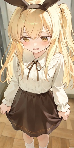 A YanQiaoke sits on a worn wooden floor, her long, curly yellow hair tied back with a ribbon headband. She wears a white shirt and a brown skirt, the latter lifted to reveal her socks and toes. Her brown eyes flash with disgust as she holds her shoes in one hand and lifts the hem of her skirt with the other, her feet bare and pale.